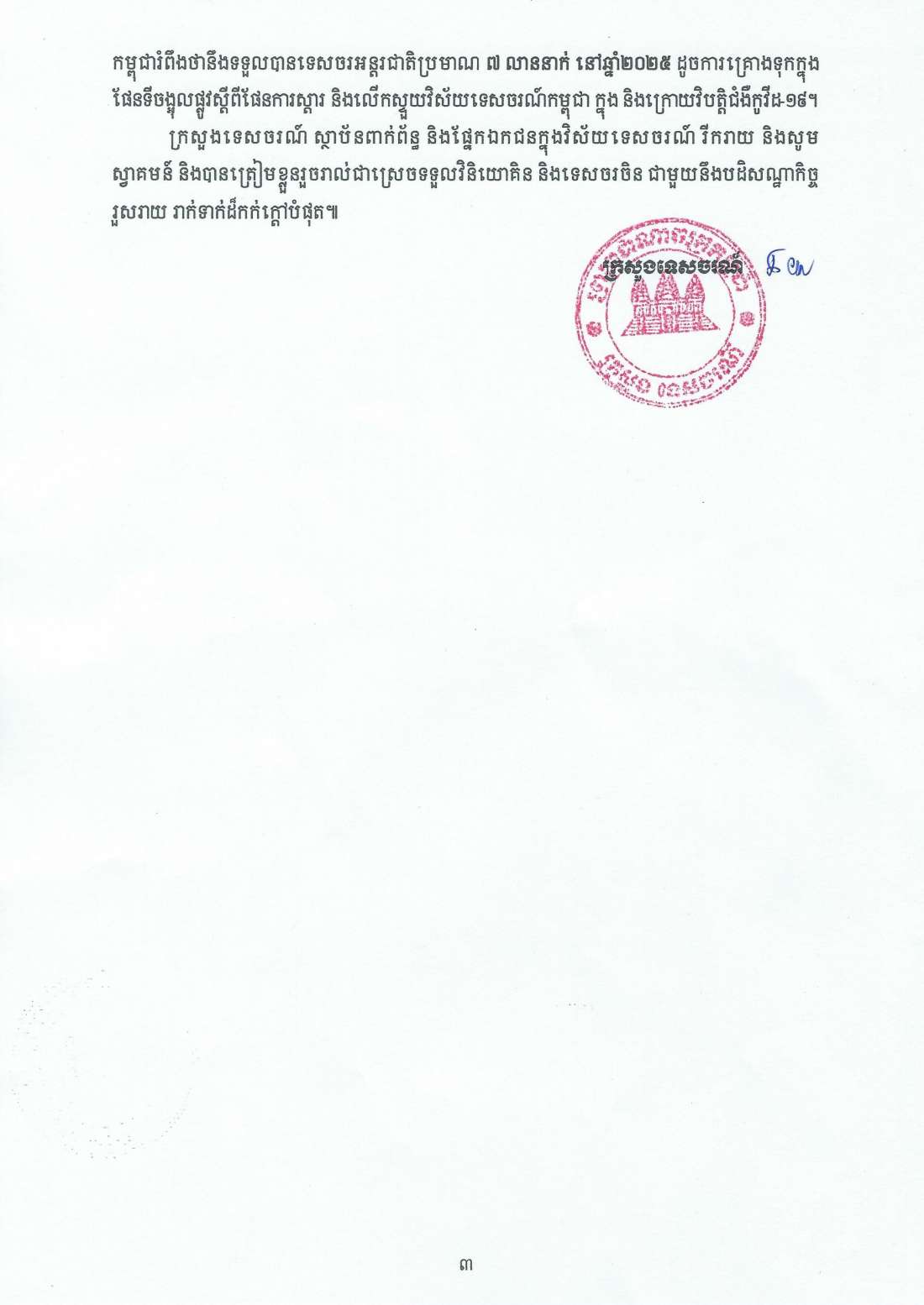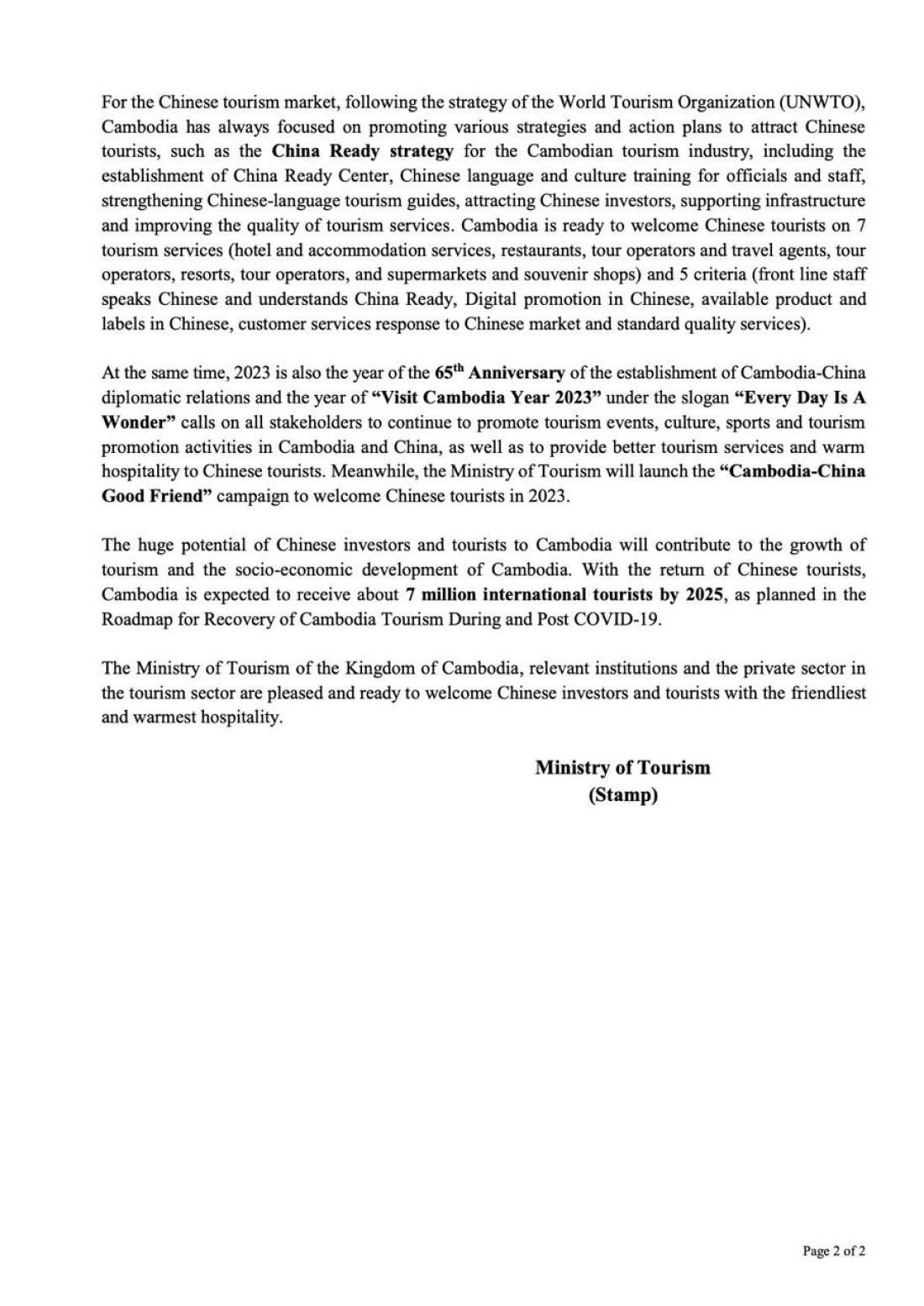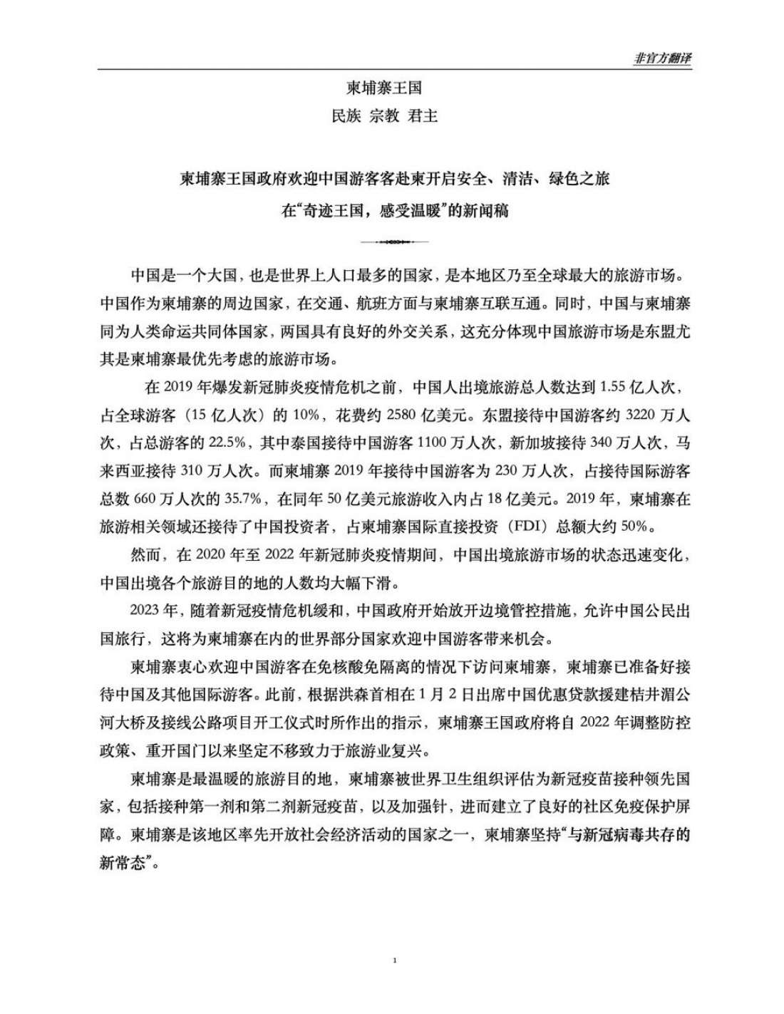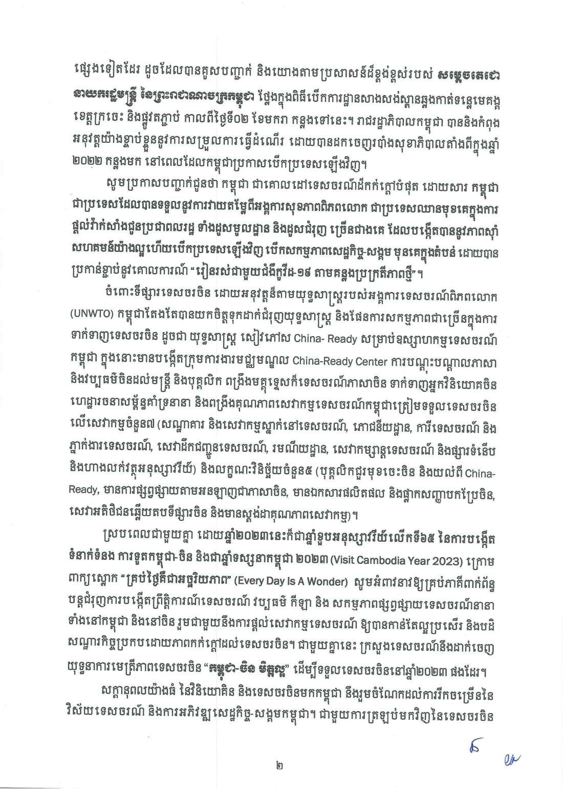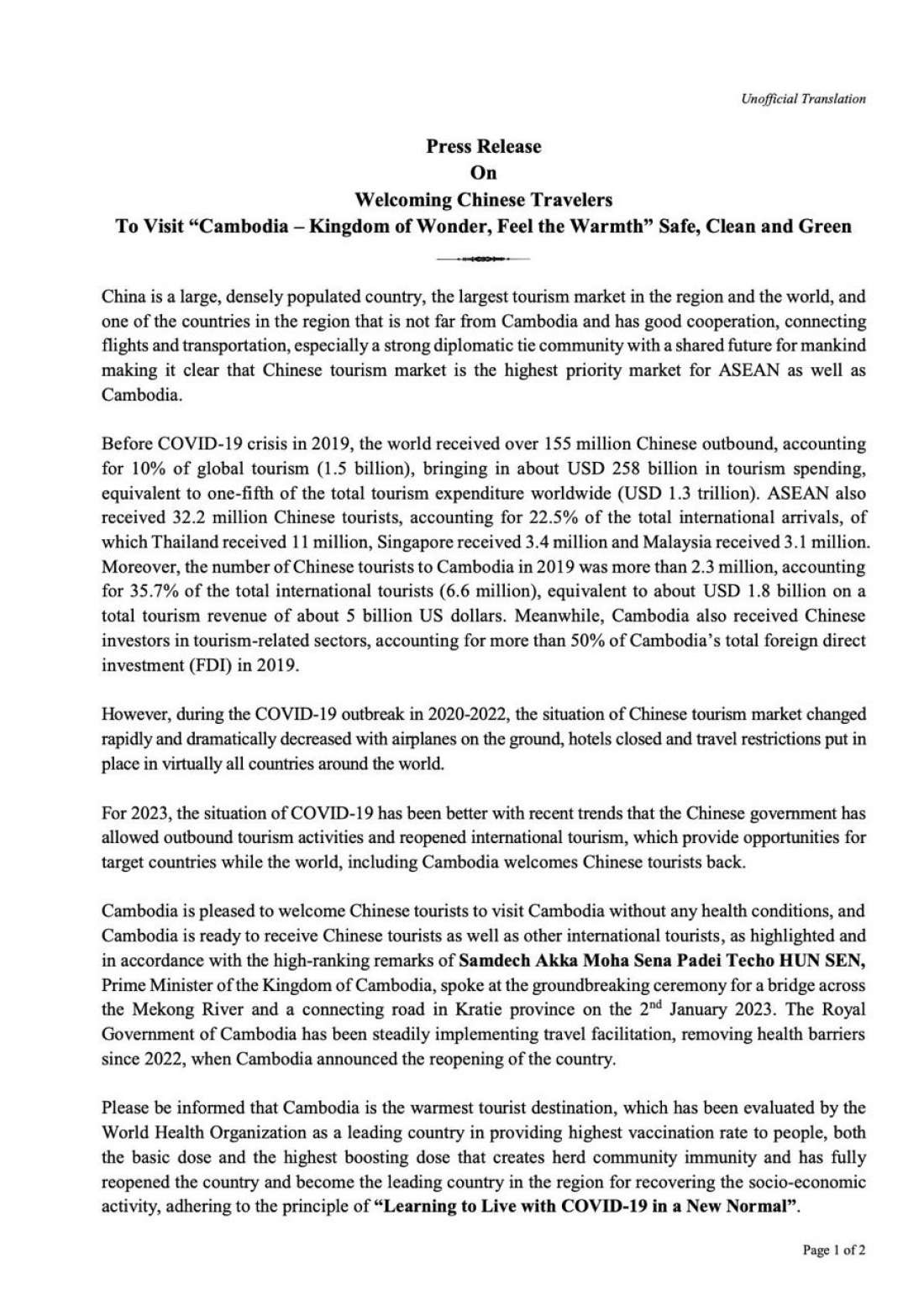 សេចក្តីប្រកាសព័ត៌មាន ស្តីពី កម្ពុជាស្វាគមន៍យ៉ាងកក់ក្តៅទេសចរចិន ២០២៣